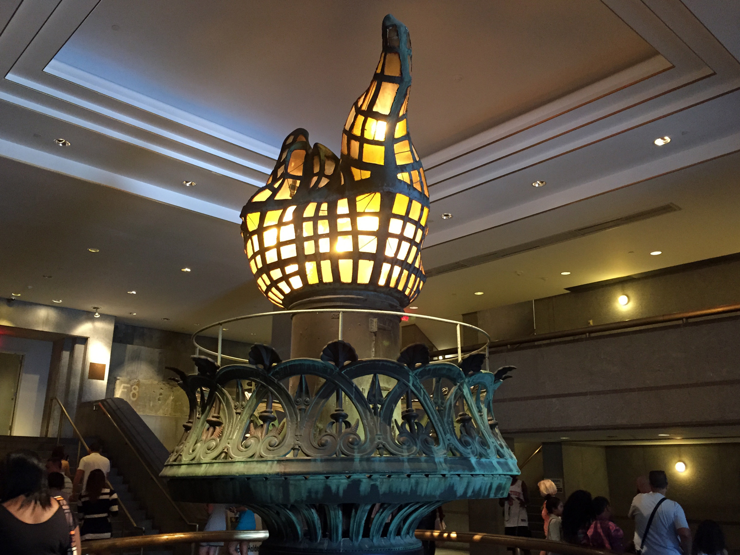 Outra coisa que mudou bastante foi a chama da tocha segurada pela mão direita de Lady Liberty, tendo as atualizaçãos mais significativas sido feitas em 1916 e 1986. Originalmente era também de cobre mas, durante as renovações realizadas em 1916, Gutzon Borglum (que esculpiu o rosto dos presidentes dos Estados Unidos no Mount Rushmore) tirou a maior parte do metal e instalou janelas de vidro. A tocha passou a ser utilizada como um farol para os navios que chegavam a Nova York e foi o primeiro a utilizar lâmpadas elétricas. Mas a chuva e a neve que entravam através das janelas estavam causando muita corrosão na estrutura e a tocha foi novamente substituída em 1986. Atualmente, a chama é folheada a ouro 24 quilates. Rica! A tocha de 1916 está exposta no hall de entrada da estátua.
