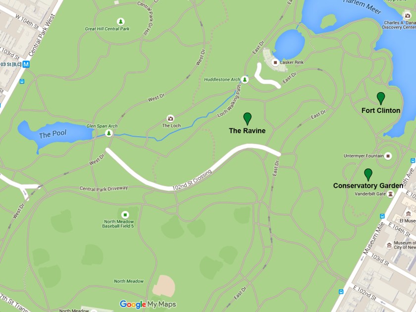 A parte mais ao Norte do Central Park é, certamente, a mais tranquila do parque. Ela fica bem distante da parte mais turística de Manhattan. Desci na estação 103 St, da linha 6 do metrô, e andei alguns poucos quarteirões até lá. Primeiro você sente que a região da cidade tem outra atmosfera – leia-se: é meio estranha, dando até uma certa insegurança no começo. Não é aquele território já por nós conhecido, seja pessoalmente, seja em filmes e outras mídias. Mas, depois de um tempo, percebe-se que é exagero. Eu achei bem seguro, para falar a verdade.