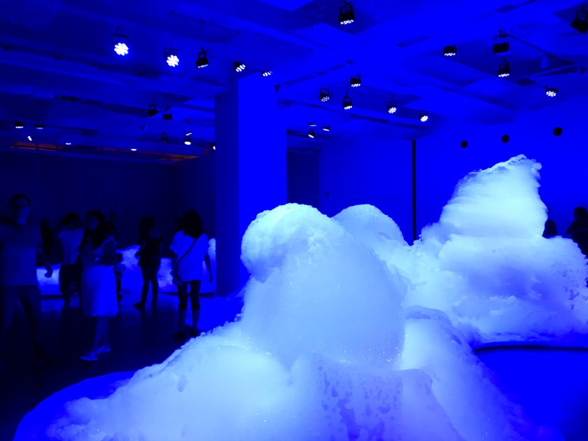 Quando eu (finalmente) fui, havia duas exposições acontecendo. No andar térreo vi a obra Espuma, do jovem artista japonês Kohei Nawa. Na extensa sala, se espalhava uma escultura autônoma formada por pequenas bolhas de um líquido similar ao sabão. Condicionadas ao seu ciclo de nascimento e destruição, como as nossas próprias células, as bolhas circulam, metabolizam e morrem, dando origem a novas formas. Achei interessante a utilização de técnicas industrais, tecnológicas e químicas para a criação de um ambiente tão leve – a sensação é a de caminhar entre as nuvens.