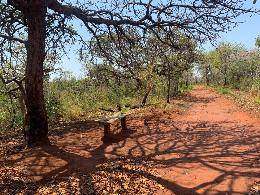 Pouco depois da metade do caminho, acaba a subida e chega-se a um ponto em que é possível parar e descansar em um banquinho, sob a sombra de uma árvore – mas não muita, já que era o fim da temporada de seca e havia poucas folhas. No dia que eu fiz esse passeio, estava fazendo muito calor e foi importante dar essa parada também para me hidratar. A recomendação é levar pelo menos um litro e meio de água por pessoa.