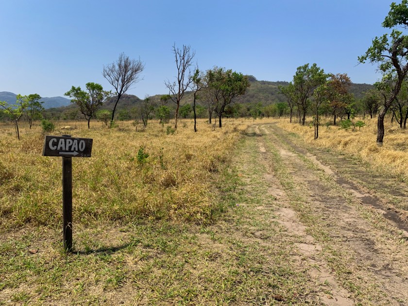 Entrando ela Portaria das Aves, que é considerada a principal, há uma placa no começo da estrada marca as distâncias para todos os atrativos dessa área. Mas você deve se informar também sobre outras questões, como quais trilhas podem ser feitas de bicicleta e o nível de dificuldade. No caso da Cachoeira Capão dos Palmitos, tem que ir caminhando mesmo, pois são muitas subidas e descidas e trechos com grandes pedras soltas. Por isso mesmo, embora sejam “apenas” cerca de 5 km de caminhada para ida e o mesmo tanto de volta, eu achei ela bem mais cansativa que outras de trajeto mais longo.