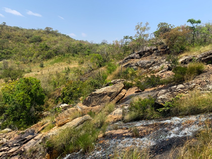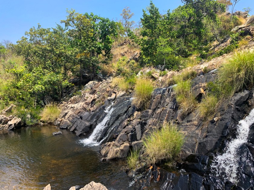 Pouco mais de 1 km depois, chegamos à parte superior da queda. Ali tem um ponto interessante de ficar porque se formou uma piscina pequena. Eu dei umas voltas para conhecer, depois peguei o caminho que fica à esquerda para chegar até o destino final.