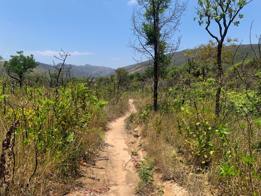 A partir desse momento, a trilha fica bem mais estreita e tortuosa, mas não chega a ser difícil pois é quase plana na maior parte do tempo. Ao longo de todo esse trajeto, eu não encontrei absolutamente nenhuma outra pessoa. Por um lado isso pode ser bastante positivo, já que significa que vai dar para curtir a cachoeira sem aglomeração de pessoas. Por outro, eu senti falta de cruzar com alguém e poder perguntar quanto tempo faltava para chegar.