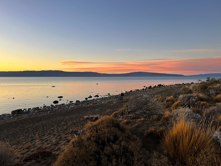 Voltamos para o veículo e descemos em direção à margem do lago, que poderia funcionar como uma praia de água doce, embora eu tenha dúvida de que alguém tenha ânimo o suficiente para se banhar nessas águas devido às baixas temperaturas durante todo o ano. A área é conhecida como Punta Walichu e chegamos lá já com o pôr-do-sol.