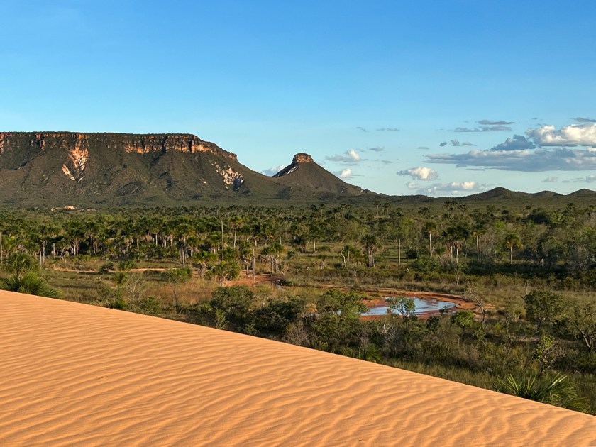 Também se destacam as dunas de areia dourada, criadas a partir da erosão de rochas areníticas das serras vizinhas. A ação contínua dos ventos, das chuvas e das altas temperaturas fragmenta essas rochas, acumulando grãos de areia na base das serras ao longo dos anos. Com até 40 metros de altura, as dunas exibem uma coloração alaranjada vibrante, que varia conforme a luz do sol, e contrastam com os cursos d’água, as veredas e a vegetação ao redor, formando um ambiente de rara beleza e rica biodiversidade. Por sua sensibilidade ecológica, o acesso é controlado, com regras específicas de visitação para evitar danos ao ecossistema.
