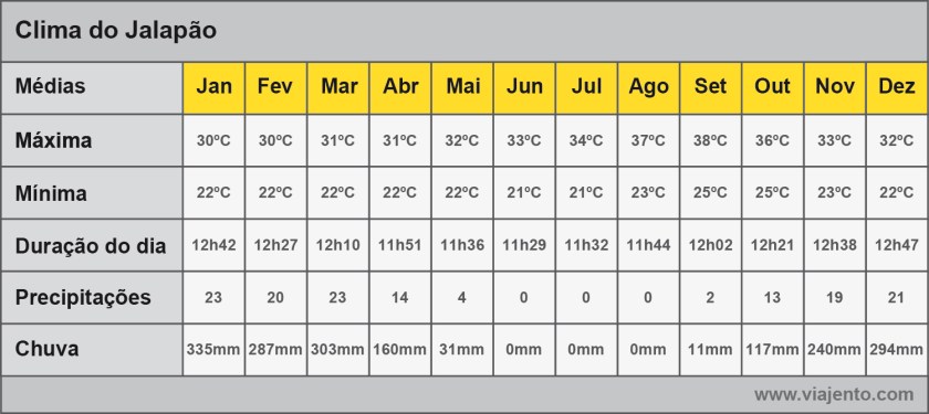 A melhor época para visitar o Jalapão é durante a estação seca, entre os meses de maio e setembro, quando as estradas de terra estão em melhores condições, o acesso aos atrativos é mais seguro e o céu permanece limpo na maior parte do tempo, favorecendo passeios ao ar livre e belas paisagens para fotografia. É também nesse período que se formam as praias de água doce às margens dos rios, um diferencial da experiência na região. Embora o calor possa ser intenso, a baixa umidade e a ausência de chuvas tornam a viagem mais confortável.