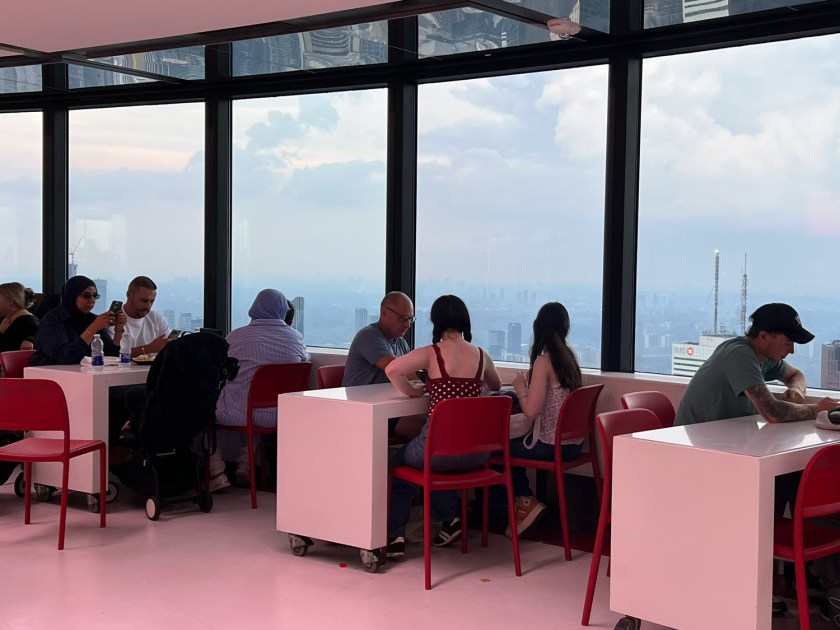 O 360 Restaurant é um restaurante giratório que completa uma volta inteira em cerca de 72 minutos. Enquanto a refeição acontece, a vista da cidade muda lentamente, oferecendo diferentes ângulos de Toronto. O cardápio prioriza ingredientes canadenses e, em geral, quem reserva uma mesa tem acesso facilitado aos mirantes, o que torna a experiência ainda mais completa.