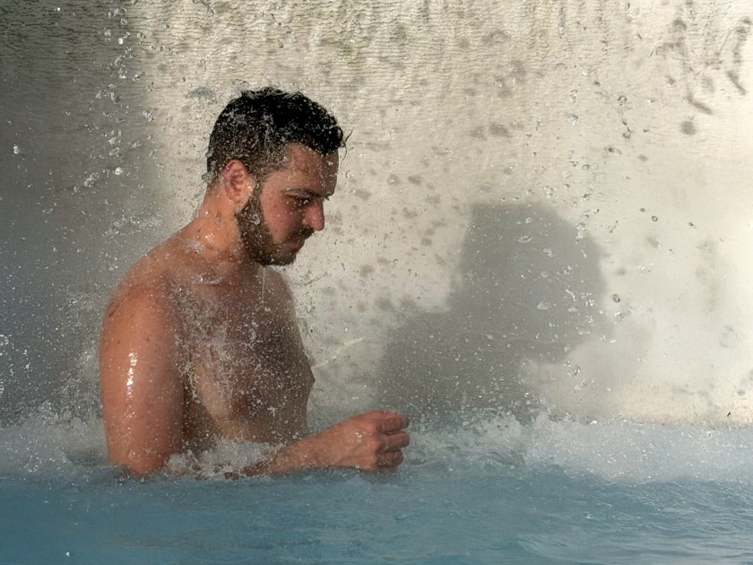 A cachoeira artificial é pequena, mas a queda d’água é suficiente para criar uma pressão sobre ombros e costas, funcionando como uma massagem natural. Muitos visitantes aproveitam o local para aliviar tensões musculares, especialmente após longos dias de viagem. A temperatura da água na cachoeira é a mesma da lagoa, mantendo o conforto.