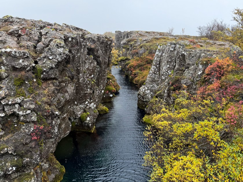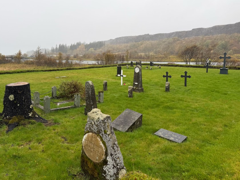 A Snorrabúð (Snorrabud) é o local onde ficava o abrigo temporário usado por Snorri Sturluson, uma das figuras mais importantes da história medieval islandesa, durante as reuniões do parlamento. Eram montadas estruturas simples de pedra e turfa para se alojar, negociar e participar das decisões políticas. Dessa parte histórica, o que pode ser visto são apenas vestígios. Ao seu lado fica o Drekkingarhylur, conhecido como “Piscina do Afogamento”. Esse local foi usado entre os séculos XVI e XVIII para a execução de mulheres condenadas por crimes considerados graves na época, como adultério e infanticídio. Elas eram afogadas nas águas profundas da fenda rochosa, enquanto os homens geralmente recebiam outras penas. Algumas placas explicativas ajudam a entender o contexto jurídico e social da Islândia medieval.