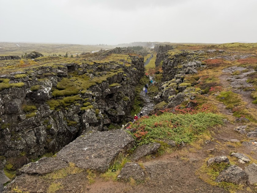 A Snorrabúð (Snorrabud) é o local onde ficava o abrigo temporário usado por Snorri Sturluson, uma das figuras mais importantes da história medieval islandesa, durante as reuniões do parlamento. Eram montadas estruturas simples de pedra e turfa para se alojar, negociar e participar das decisões políticas. Dessa parte histórica, o que pode ser visto são apenas vestígios. Ao seu lado fica o Drekkingarhylur, conhecido como “Piscina do Afogamento”. Esse local foi usado entre os séculos XVI e XVIII para a execução de mulheres condenadas por crimes considerados graves na época, como adultério e infanticídio. Elas eram afogadas nas águas profundas da fenda rochosa, enquanto os homens geralmente recebiam outras penas. Algumas placas explicativas ajudam a entender o contexto jurídico e social da Islândia medieval.