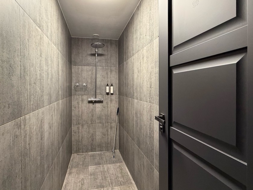 Os chuveiros também são privativos, oferecendo mais privacidade aos hóspedes. Cada box possui porta que pode ser trancada por dentro para garantir o uso individual e cabide para roupas e toalhas. A água quente é estável e a pressão costuma ser boa, mesmo nos horários de pico. Para muitos viajantes, esse é um dos pontos fortes, visto que outros albergues e acampamentos contam com banho comunitário.