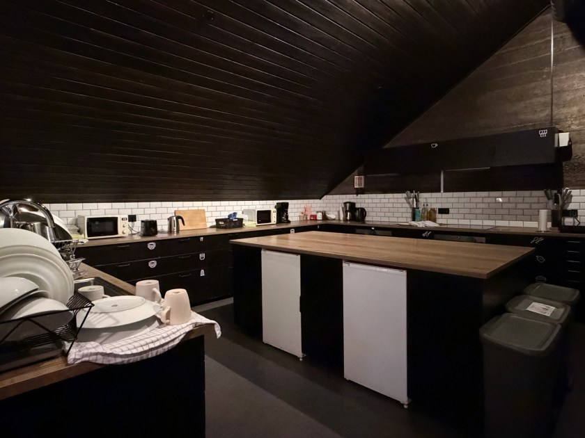 A cozinha compartilhada é ampla e bem equipada, com fogões, fornos, micro-ondas, geladeiras e utensílios básicos. No entanto, costuma ficar bem movimentada no início da manhã e no início da noite, horários em que a maioria dos hóspedes prepara café da manhã e jantar. Em alta temporada, pode ser necessário esperar espaço para cozinhar.