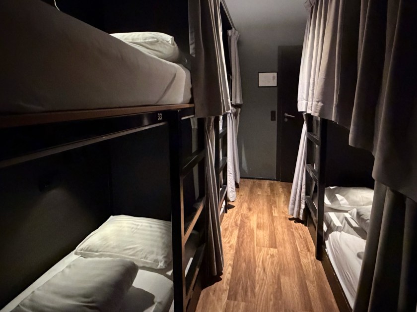 Os quartos compartilhados contam com camas de solteiro ou de casal em beliches. Esses dormitórios acomodam de 4 a 12 pessoas e são mistos, ou seja, podem ser usados por homens e mulheres. Cada cama possui cortina blackout, tomada individual, luz de leitura e prateleira de apoio. Esse conjunto garante mais privacidade, mesmo em ambientes coletivos. Os colchões são firmes e adequados para noites de descanso após longos passeios. Há armários individuais para guardar mochilas e malas, sendo necessário levar cadeado.