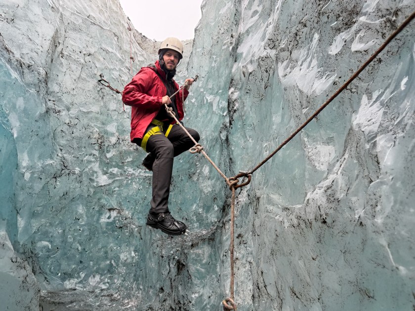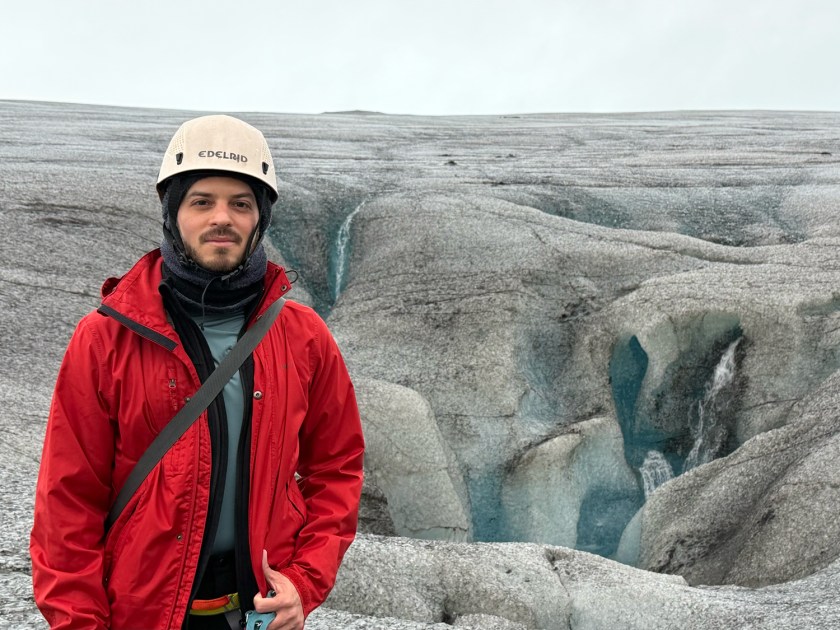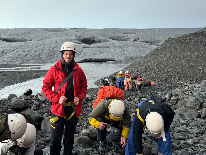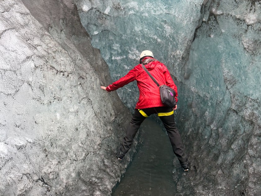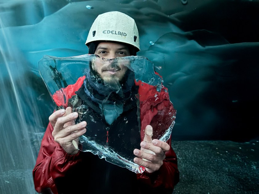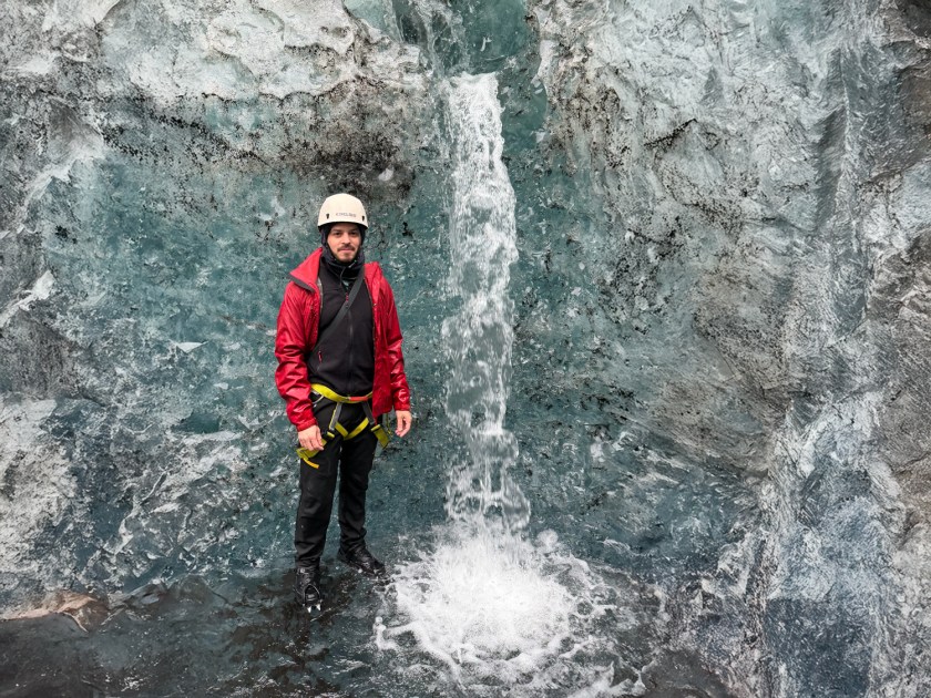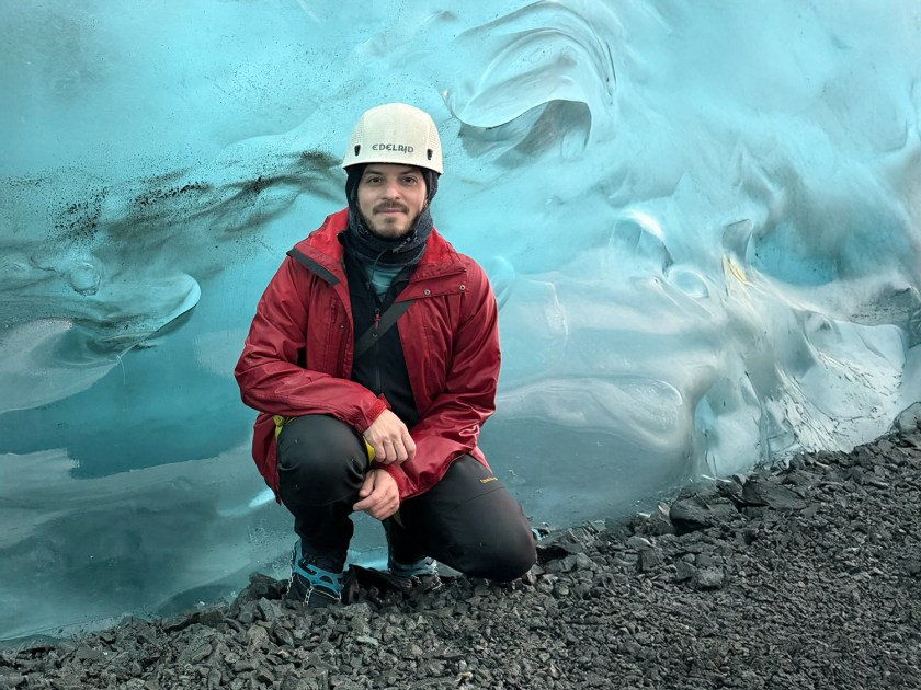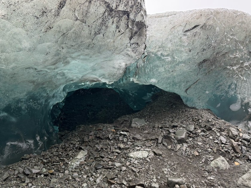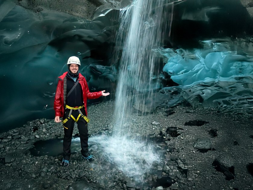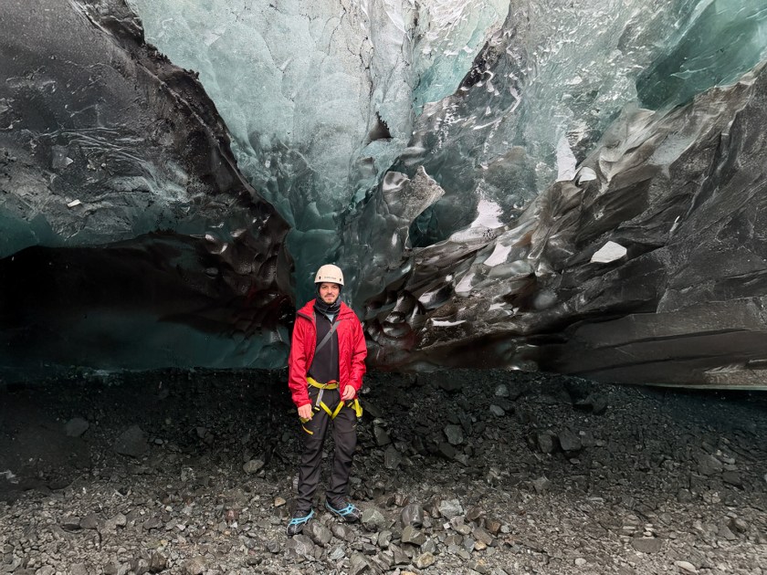 Chegando ao destino principal do passeio, a terceira e última caverna de gelo visitada nesse dia. Em algumas áreas, o gelo apresenta coloração escura. Isso acontece devido à deposição de cinzas vulcânicas ao longo dos anos. A Islândia possui intensa atividade vulcânica, e essas partículas se acumulam no glaciar, ficando presas entre as camadas de gelo. O contraste entre o preto e o azul cria paisagens únicas. Esse fenômeno também acelera o derretimento, já que o gelo escuro absorve mais calor solar. É um exemplo visível da interação entre vulcanismo e glaciação.