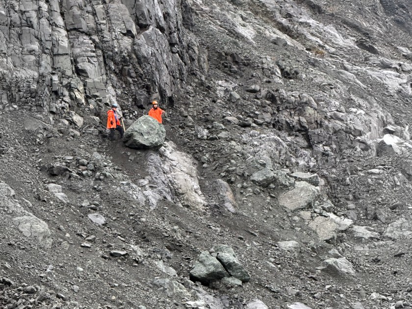 Também há o risco de queda de pedras nas encostas das montanhas. O desgelo, combinado com as chuvas e a ação dos ventos, provoca deslizamentos. Pequenas rochas podem se soltar sem aviso e os guias escolhem rotas que minimizam esse perigo. Nesse dia, foi preciso esperar por um tempo enquanto dois profissionais derrubavam uma rocha. Depois de feito o trabalho, a passagem foi novamente liberada.