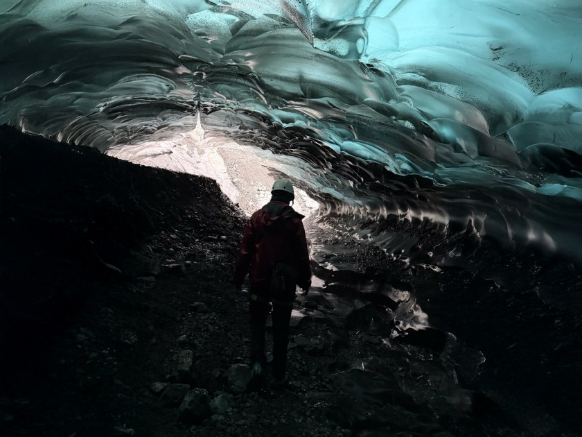 Chegando ao destino principal do passeio, a terceira e última caverna de gelo visitada nesse dia. Em algumas áreas, o gelo apresenta coloração escura. Isso acontece devido à deposição de cinzas vulcânicas ao longo dos anos. A Islândia possui intensa atividade vulcânica, e essas partículas se acumulam no glaciar, ficando presas entre as camadas de gelo. O contraste entre o preto e o azul cria paisagens únicas. Esse fenômeno também acelera o derretimento, já que o gelo escuro absorve mais calor solar. É um exemplo visível da interação entre vulcanismo e glaciação.
