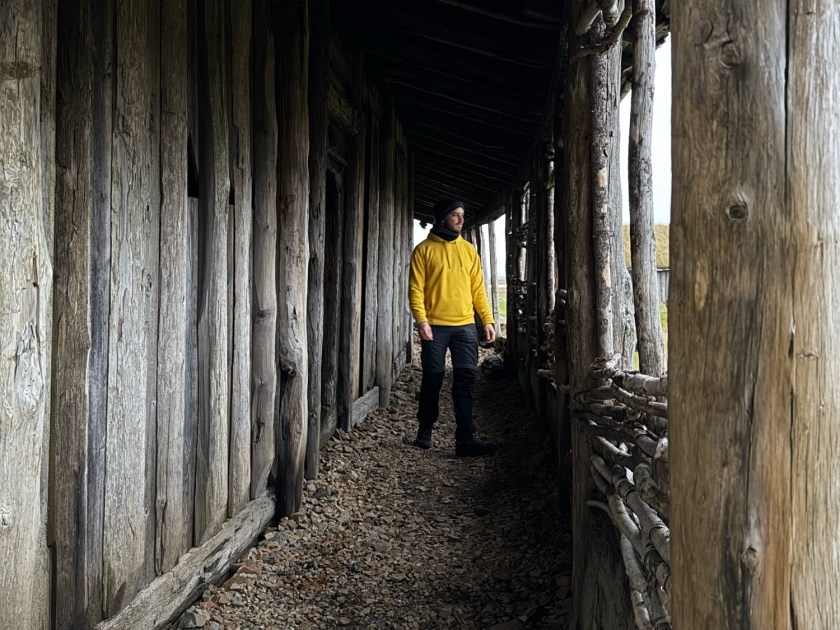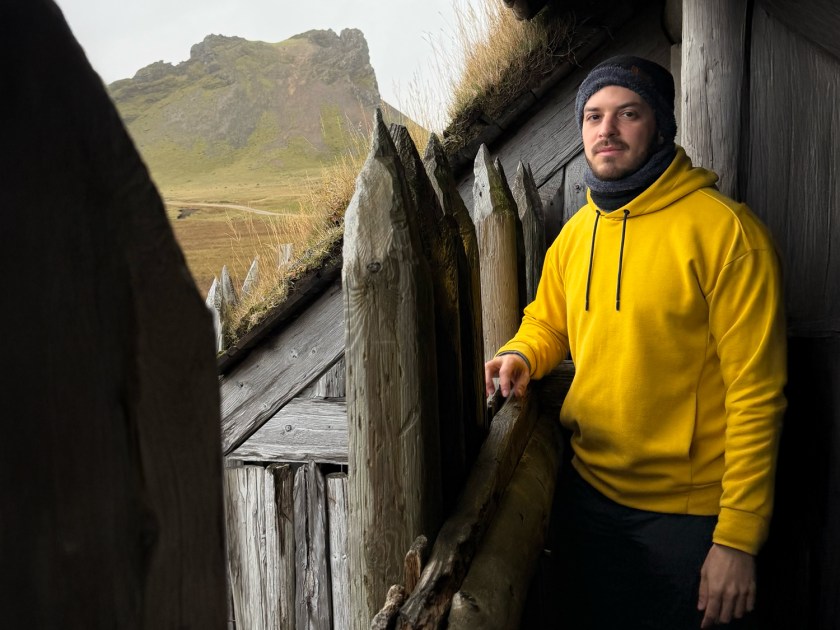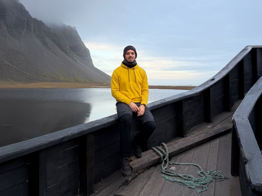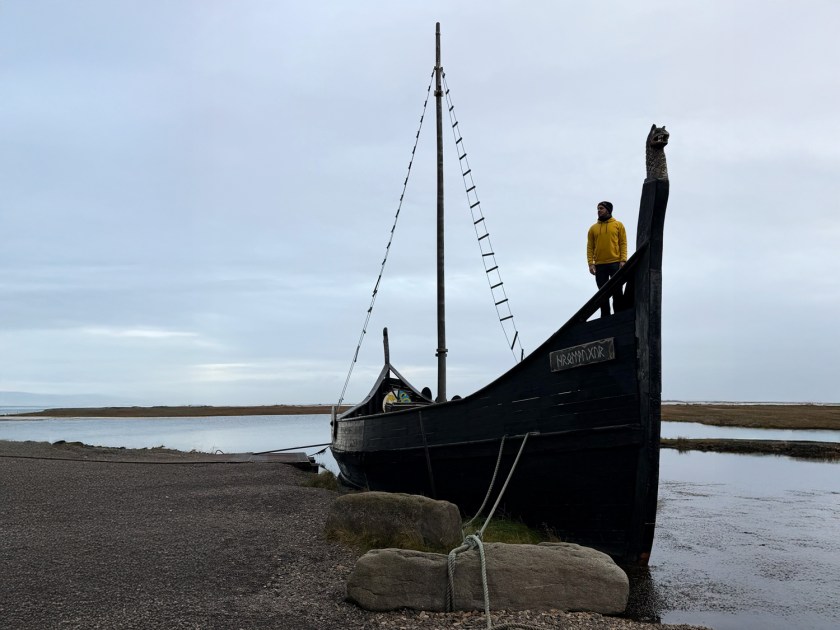 A trilha com cerca de 850 metros do estacionamento até a vila é bem tranquila, toda plana. Ao chegar, encontra-se um barco viking construído com madeira escura e detalhes rústicos. Muitos visitantes aproveitam para posar dentro ou ao lado da embarcação. Apesar da aparência antiga, trata-se de uma estrutura relativamente recente e que não entra em operação, sendo apenas decorativa. Com o fundo da montanha, o cenário fica ainda mais impressionante, mas o dia nublado atrapalha bastante a visão.
