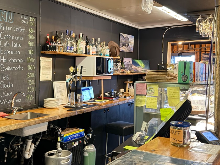 O Viking Cafe é o ponto de apoio principal para os visitantes da área. É ali que se compra o ingresso para acessar a vila, a praia e os demais atrativos do complexo. O espaço funciona também como cafeteria e loja de souvenirs, oferecendo bebidas quentes, lanches e lembranças temáticas. Em dias frios ou ventosos, o local se torna um refúgio confortável. Há banheiros limpos, a área interna aquecida, internet liberada e tomadas próximas às mesas para recarregar o celular e outros equipamentos. Além disso, o café fornece mapas e informações úteis sobre a região.
