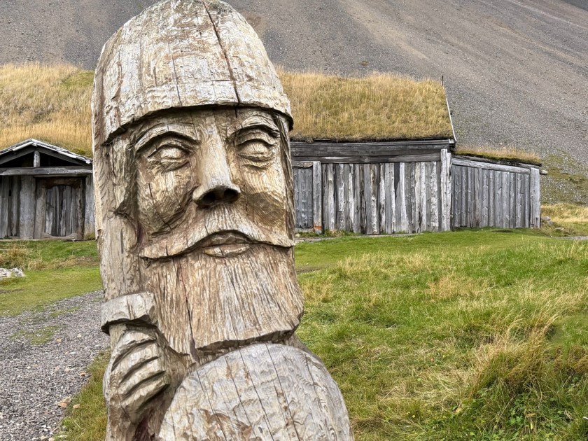 Ainda assim, a visita foi interessante. Uma das peças mais simbólicas da vila é a escultura de rosto em madeira. Ela representa um guerreiro viking, com traços fortes e expressão marcante. A peça apresenta detalhes bem trabalhados, mesmo após anos de exposição ao clima. A ação do vento, da chuva e da neve já deixou marcas na madeira, reforçando o aspecto rústico do local.