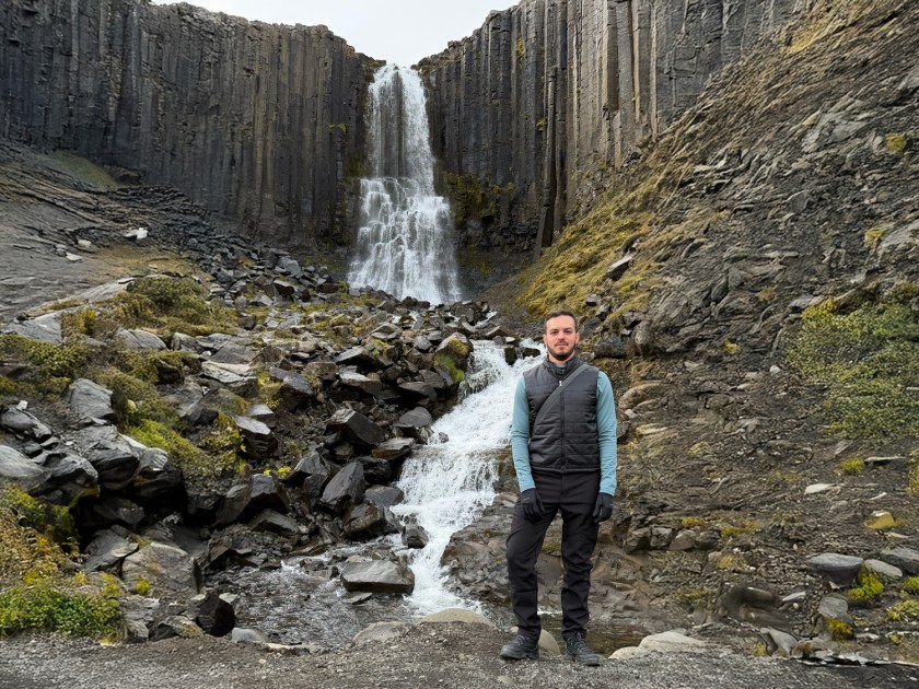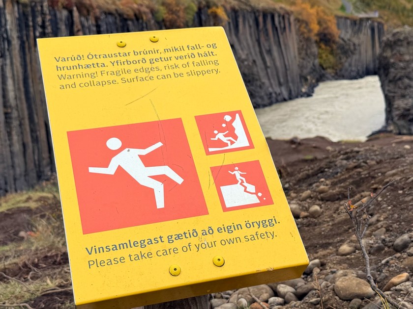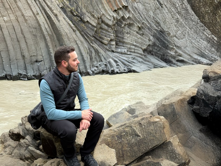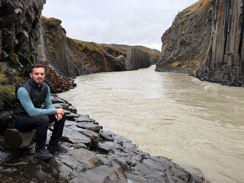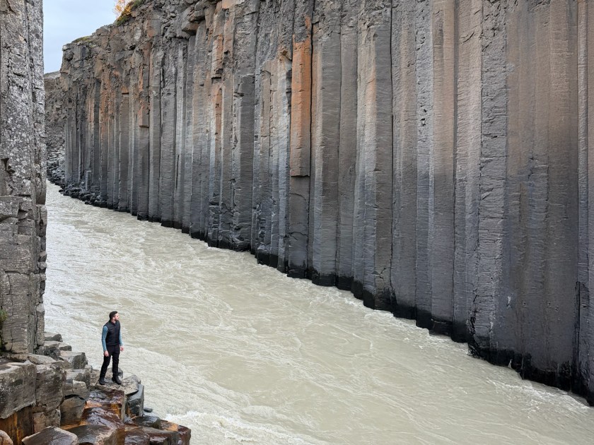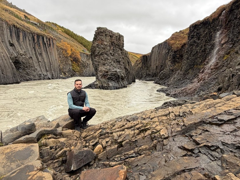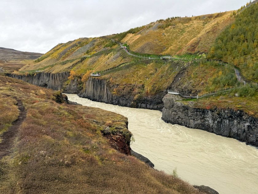 Logo na saída é possível observar a cachoeira Studlafoss, que já antecipa o tipo de paisagem que aparece no cânion. A queda d’água não é muito alta, mas chama atenção por estar cercada por formações de basalto. Essas colunas vulcânicas aparecem tanto nas margens quanto no leito do rio. Como fica muito próximo do estacionamento, esse ponto costuma ser a primeira parada para fotos. A cachoeira também ajuda a indicar que você está no caminho certo para o cânion principal. A partir dali, a trilha continua acompanhando o curso do rio.