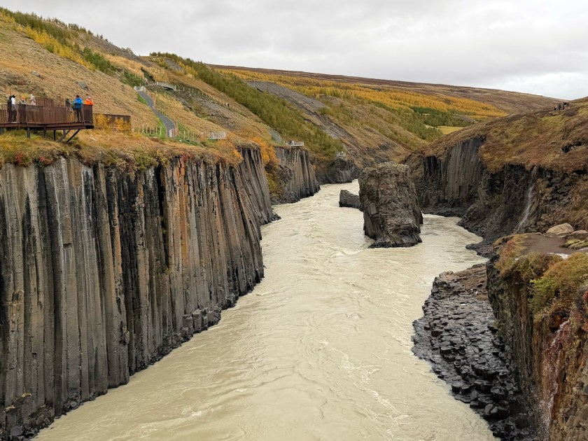 Logo na saída é possível observar a cachoeira Studlafoss, que já antecipa o tipo de paisagem que aparece no cânion. A queda d’água não é muito alta, mas chama atenção por estar cercada por formações de basalto. Essas colunas vulcânicas aparecem tanto nas margens quanto no leito do rio. Como fica muito próximo do estacionamento, esse ponto costuma ser a primeira parada para fotos. A cachoeira também ajuda a indicar que você está no caminho certo para o cânion principal. A partir dali, a trilha continua acompanhando o curso do rio.