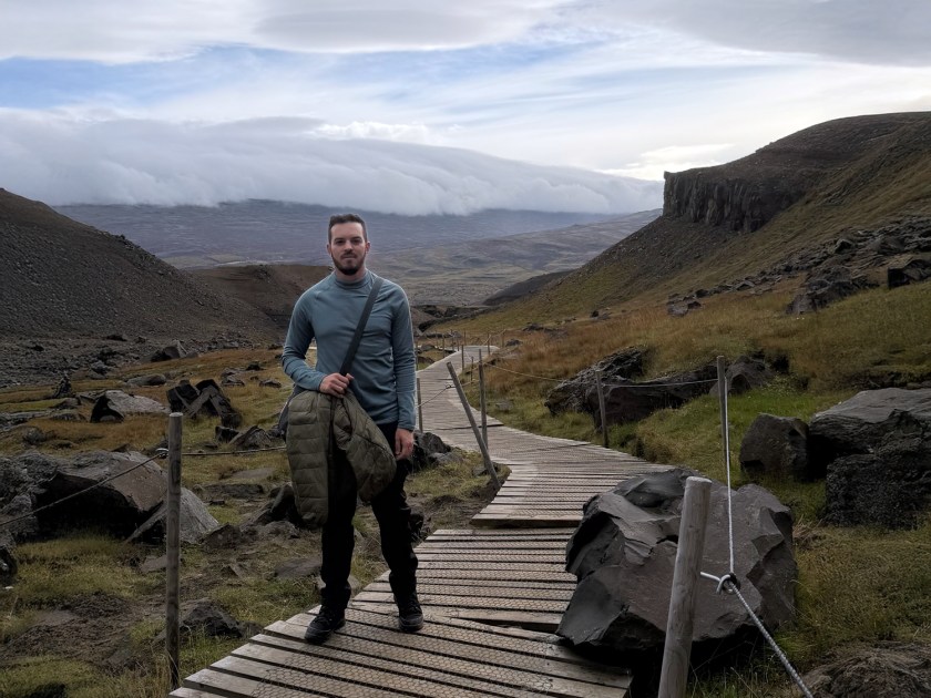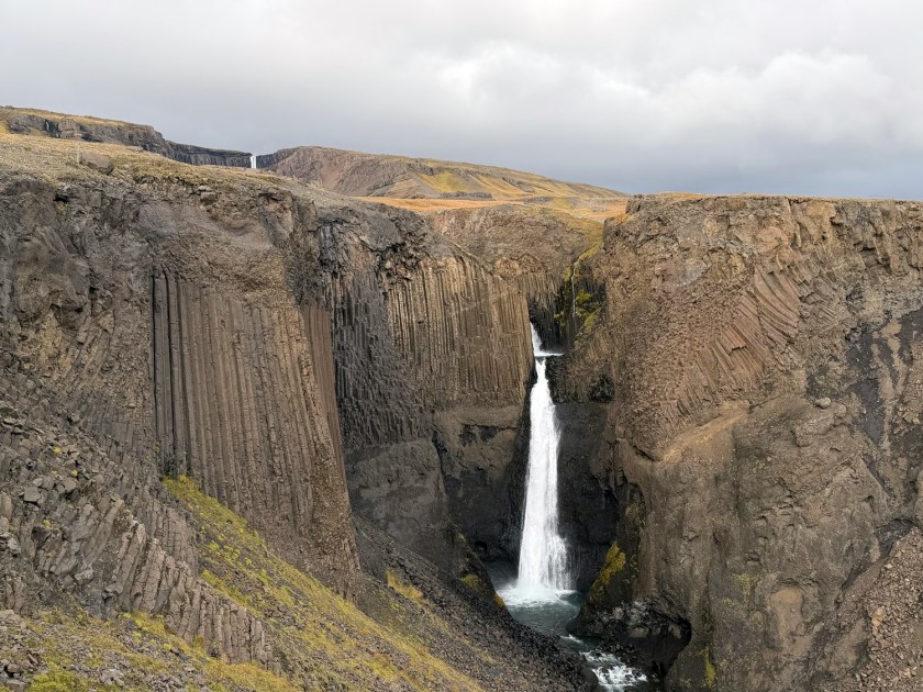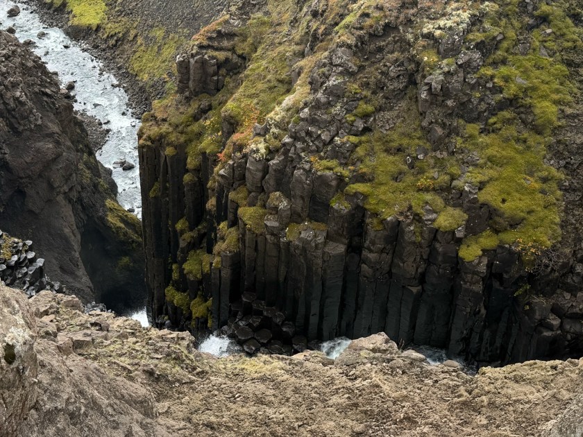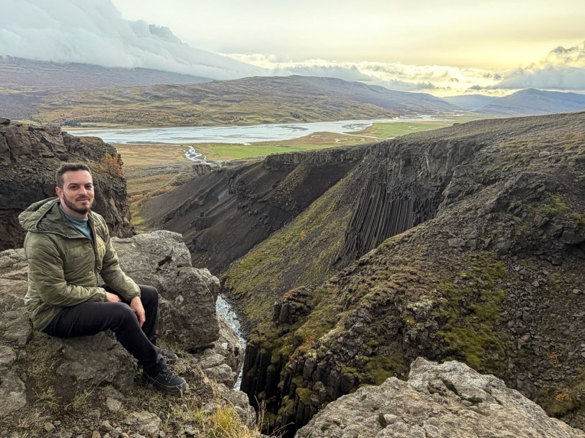 No meio da trilha, vale a pena fazer uma pausa para apreciar a cachoeira Litlanesfoss. Com cerca de 30 metros de altura, ela se destaca menos pela dimensão e mais pelo cenário geológico que a cerca. A queda d’água está encaixada em um anfiteatro natural formado por colunas de basalto extremamente regulares. Essas estruturas rochosas surgem quando lava vulcânica esfria rapidamente e se contrai, criando formações verticais e hexagonais. Algumas delas podem atingir até 15 ou 20 metros de altura, criando uma paisagem impressionante.