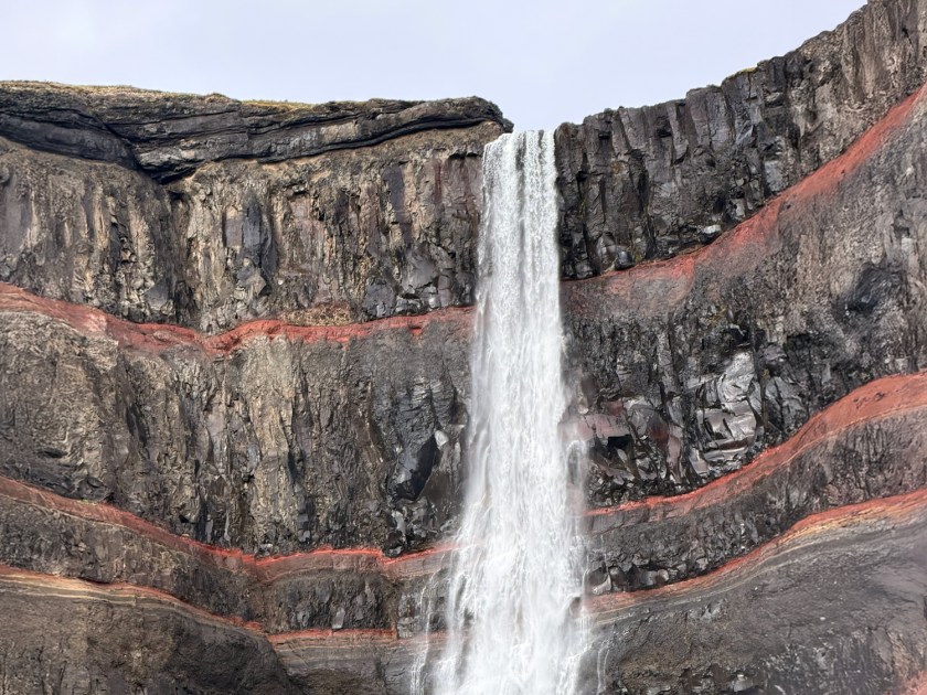 Ao final da trilha, o visitante chega ao principal mirante da Hengifoss. A cachoeira despenca de um paredão com cerca de 128 metros de altura, o que a coloca entre as três mais altas da Islândia. O grande diferencial visual está nas camadas horizontais de rocha que alternam basalto escuro e faixas vermelhas de argila rica em ferro. Essas faixas são registros geológicos de antigas erupções vulcânicas e períodos de sedimentação ocorridos há milhões de anos. Não é permitido chegar mais próximo ou entrar na água.
