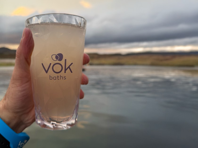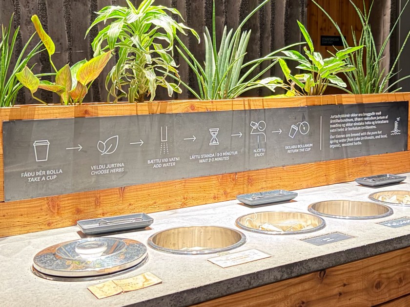 O ingresso inclui uma degustação de chá preparado com a própria água geotérmica do local, que é tão pura que pode ser consumida sem problemas. De fato, é considerada a única água termal da Islândia certificada como potável, algo único entre os spas do país. São oferecidas diferentes ervas para criar bebidas quentes aromáticas, que podem ser consumidas no momento da entrada ou da saída. Essa experiência ajuda a reforçar o conceito de bem-estar associado ao spa.