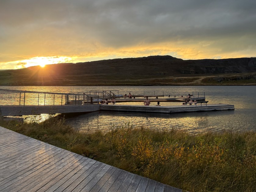 A Vök Baths é conhecida por abrigar as primeiras piscinas geotérmicas flutuantes do país. Elas foram projetadas para imitar um fenômeno natural da região chamado “vök”, que são buracos no gelo que surgem quando a água quente subterrânea derrete o gelo do lago durante o inverno. Ao recriar esse fenômeno, o complexo permite que os visitantes se banhem cercados pelo Lago Urriðavatn. Isso cria a sensação de maior integração com a natureza.