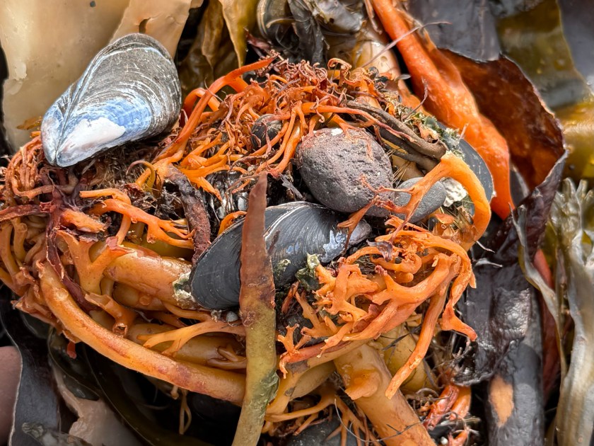 Caminhando pela faixa de areia, é possível encontrar pequenas conchas espalhadas entre os sedimentos escuros da praia. Elas aparecem principalmente em trechos onde as ondas depositam materiais trazidos pelo oceano. As algas marinhas de diferentes tonalidades também são comuns ao longo da costa. Esses elementos naturais ajudam a compor a paisagem e indicam a presença de vida marinha na região.
